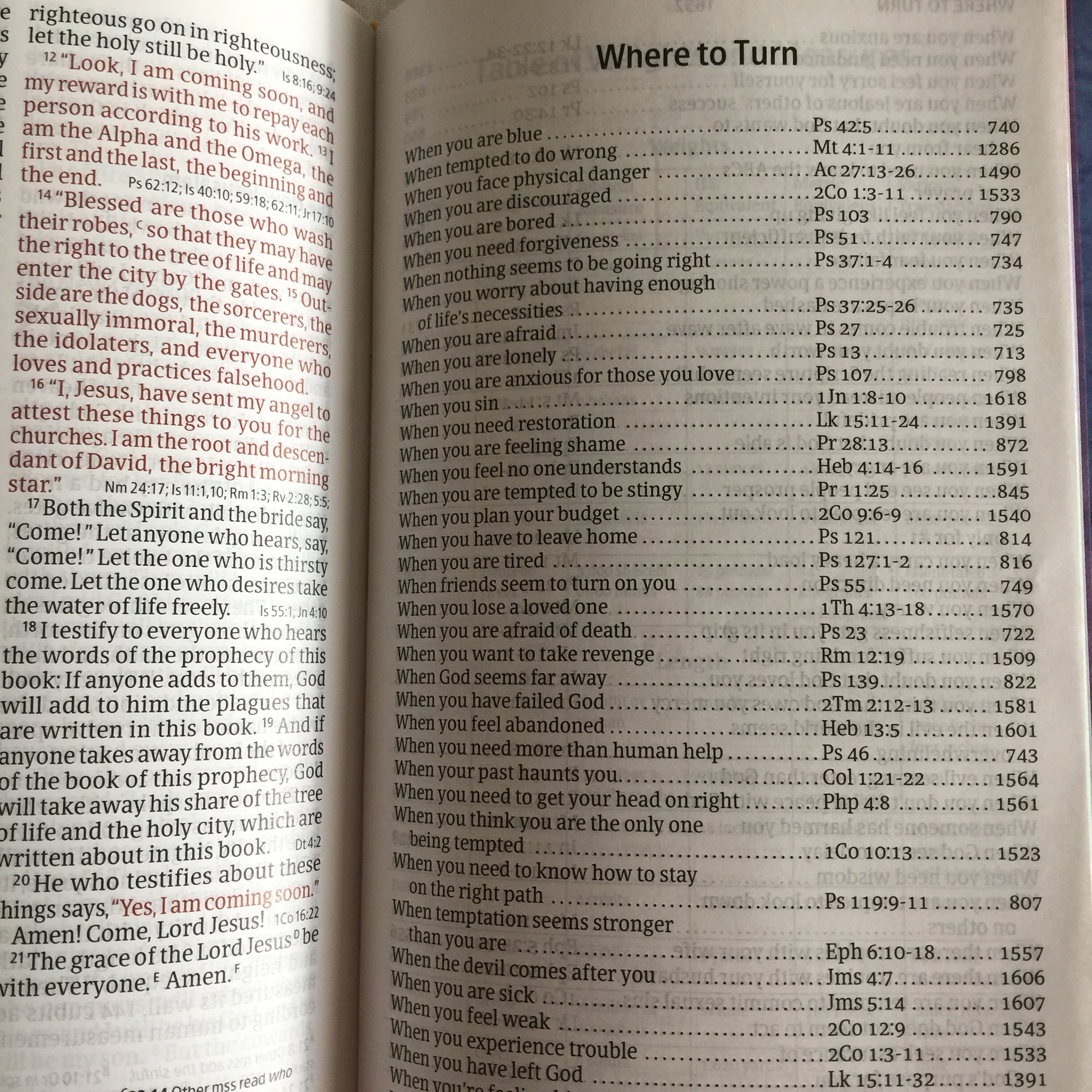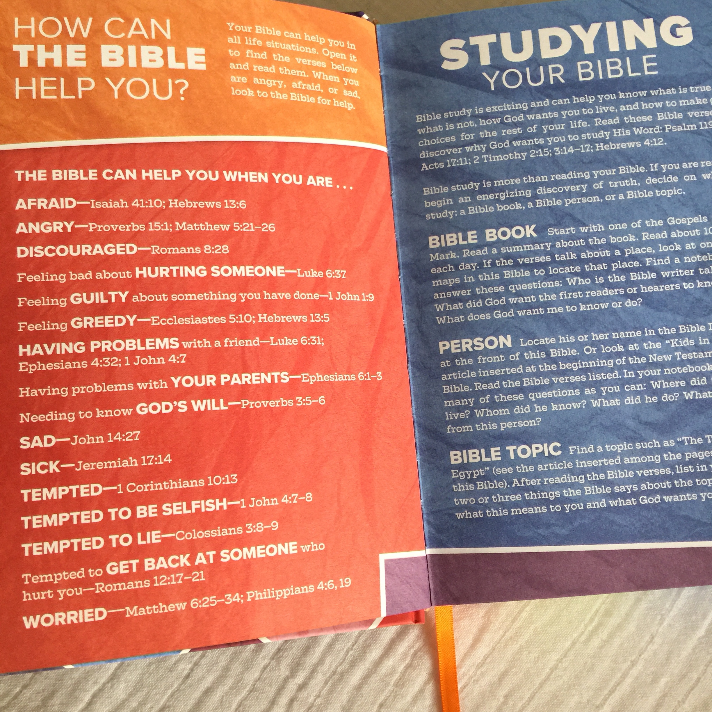 Although this is not a traditional study Bible, it does include supplemental material in the front and back with special pages throughout. The front pages have special features like explanations and questions to ponder and quizzes for Bible knowledge. Throughout the text is colorful pages that explain the parts of the Bible and some of the main characters. In the back is an index called “Where to Turn” that gives a list of verses based on specific topics like “when I’m sad” discouraged, bored, angry, etc.