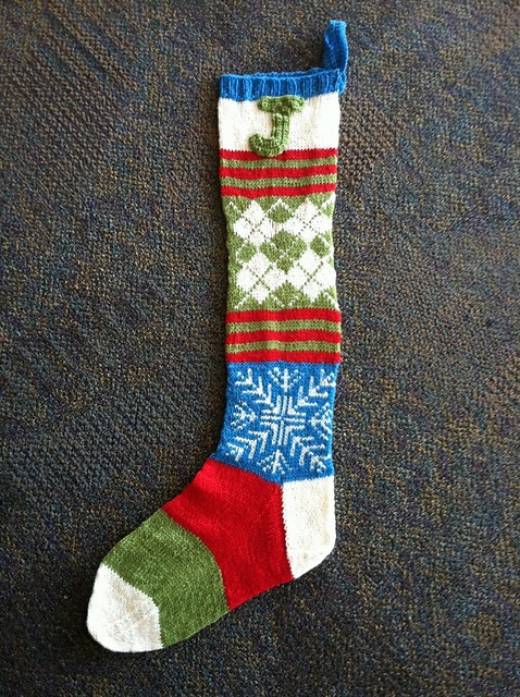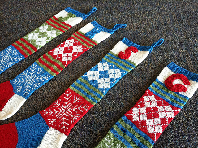 I think the design element that makes these stockings even more charming than all that wonderful argyle and snowflakes are the crocheted initial patches. The recipient’s names were too long to embroider on, so I came up with this alternative. Luckily I was thumbing through a crochet dictionary I rarely look at; as soon as I saw the pattern for these letters, I knew that I had to do that for these stockings. I’m just thrilled with the results.