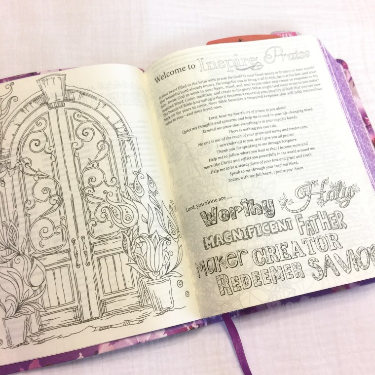 My biggest question when I heard that they were releasing an all-new Bible was will it have the same art or new art? Answer: all new art! And not only that, the Inspire Praise has new features as well. Here is the description from the publisher: “The new Inspire PRAISE Bible has even more beautiful line-art illustrations to color, with nearly 500 all-new full- and partial-page Scripture illustrations attractively displayed throughout the Bible! Bonus features of Inspire PRAISE include even thicker Bible paper; thirty-two colorful, transparent, praise-themed journaling pages to enhance your coloring and creative journaling journey through the Bible; plus, three sheets of PRAISE-themed stickers and a purple pocket in the back of the Bible for storing journaling embellishments. Leave traces of faith―and PRAISE―throughout the Bible for a treasure that will truly inspire! The lightly-ruled, two-inch-wide margins offer additional space to write notes and reflections or to draw and create. The 8.65-point font is larger than most full-size journaling Bibles, and the high-quality Bible paper makes it a great choice for creatively responding to God’s Word right on the pages of the Bible.”