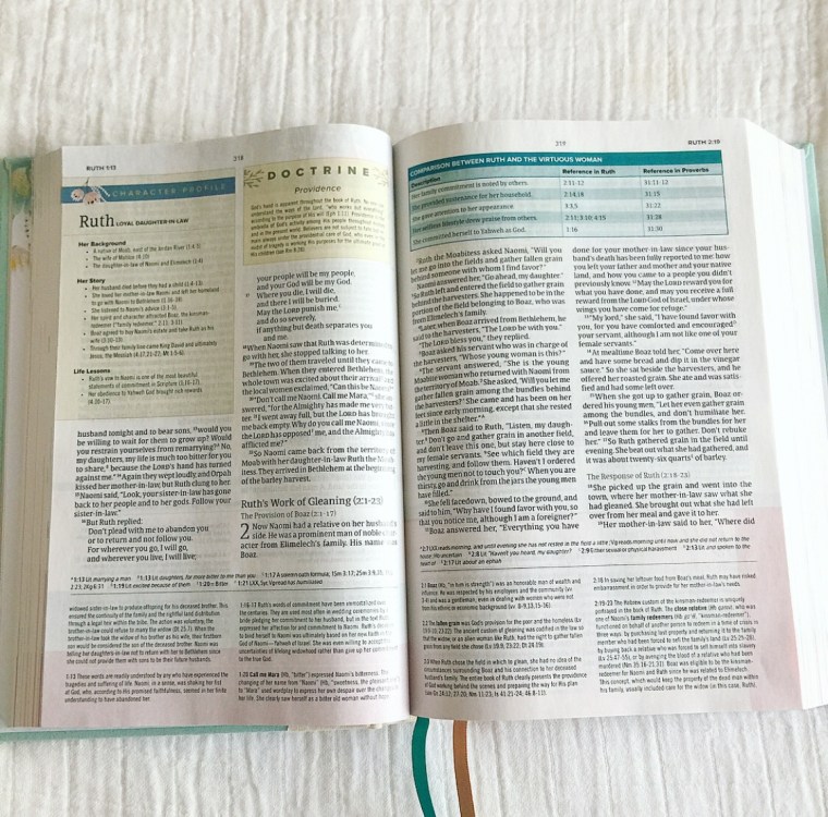 At the beginning of this Bible is an introduction and an article on how to study the Bible. I love that this article encourages women to study the text deeply for themselves, with the guidance of the Holy Spirit, God’s word, the resources included in this Bible as well as outside resources. This Bible isn’t about devotions and emotions, it’s about study God’s word to know him better. It gives lots of great suggestions about how to have personal Bible study and engage with the word of God.