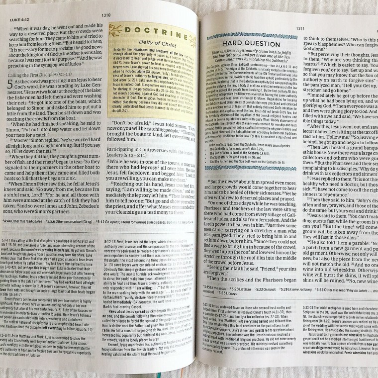 The over 5,900 study notes also provide extra guidance when reading certain passages. The notes are offset in a light gray box at the bottom of each page. The scripture text is double column, with a cross-reference center column.