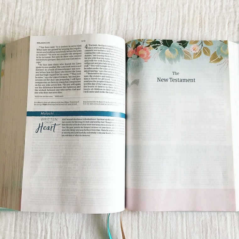 The hardcover is a soft touch cover with floral detail and etching. The endpapers are printed with a beautiful pink, green and teal floral print. The Bible also includes 2 ribbon bookmarks, which I absolutely love when publishers do this. It helps to have multiple bookmarks if you are reading different sections, or want to go back and reread a passage while still keeping your current place. The bookmarks match the colors of the pink and teal cover.