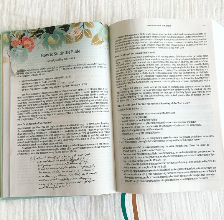 At the beginning of this Bible is an introduction and an article on how to study the Bible. I love that this article encourages women to study the text deeply for themselves, with the guidance of the Holy Spirit, God’s word, the resources included in this Bible as well as outside resources. This Bible isn’t about devotions and emotions, it’s about study God’s word to know him better. It gives lots of great suggestions about how to have personal Bible study and engage with the word of God.