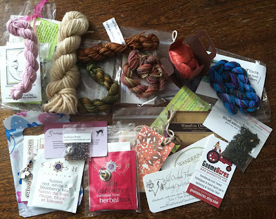 Basically, the Phat Fiber box is a monthly box centered on a different theme each time. Independent fiber artists from around the world send in contributions, which are samples of their work (yarn, fiber, teas, gift tags, stitch markers) to include in the box. Secret “drop” times (one in the morning and one in the afternoon) are emailed to everyone on an email list, and then you wait on the website until the boxes go “live.” Hundreds of people are trying to snag a box all at once, and the thrill of the chase is so exciting (and probably devastating if you don’t get one). They are usually gone in a few minutes. The whole point of the Phat Fiber box is to support independent fiber artists and to try out samples of their work. You can either get a “Stitches” (yarn), a “Fluff” (spinning fiber), or a “Mixed” (both yarn and fiber) box.